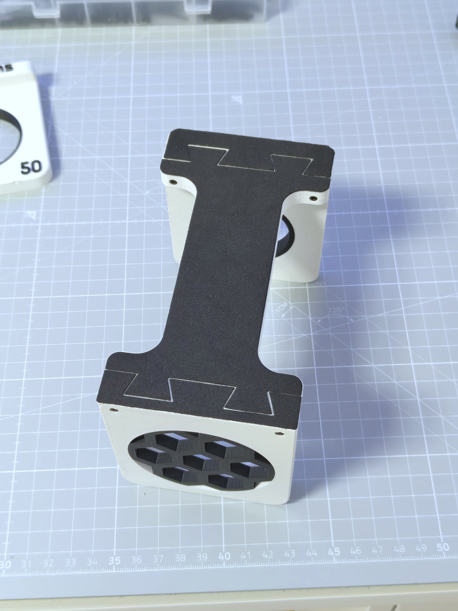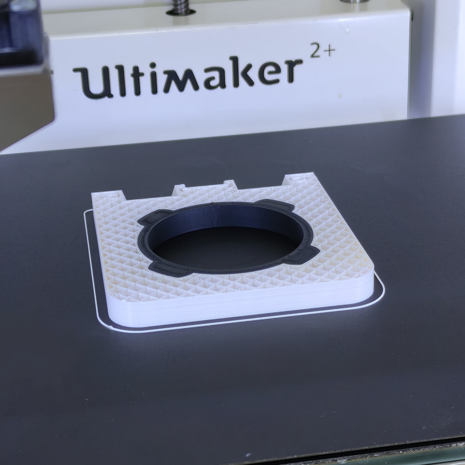 This image shows the printing process of one part of our silencer mounts. A special feature is the black section made from ABS, while the rest is printed from PLA. This material combination offers increased temperature resistance — the ABS parts can withstand temperatures up to 100°C without deforming, making them ideal if the silencer is still warm. All components are printed in-house on our Ultimaker 2+ farm, ensuring precision and quality in every piece.