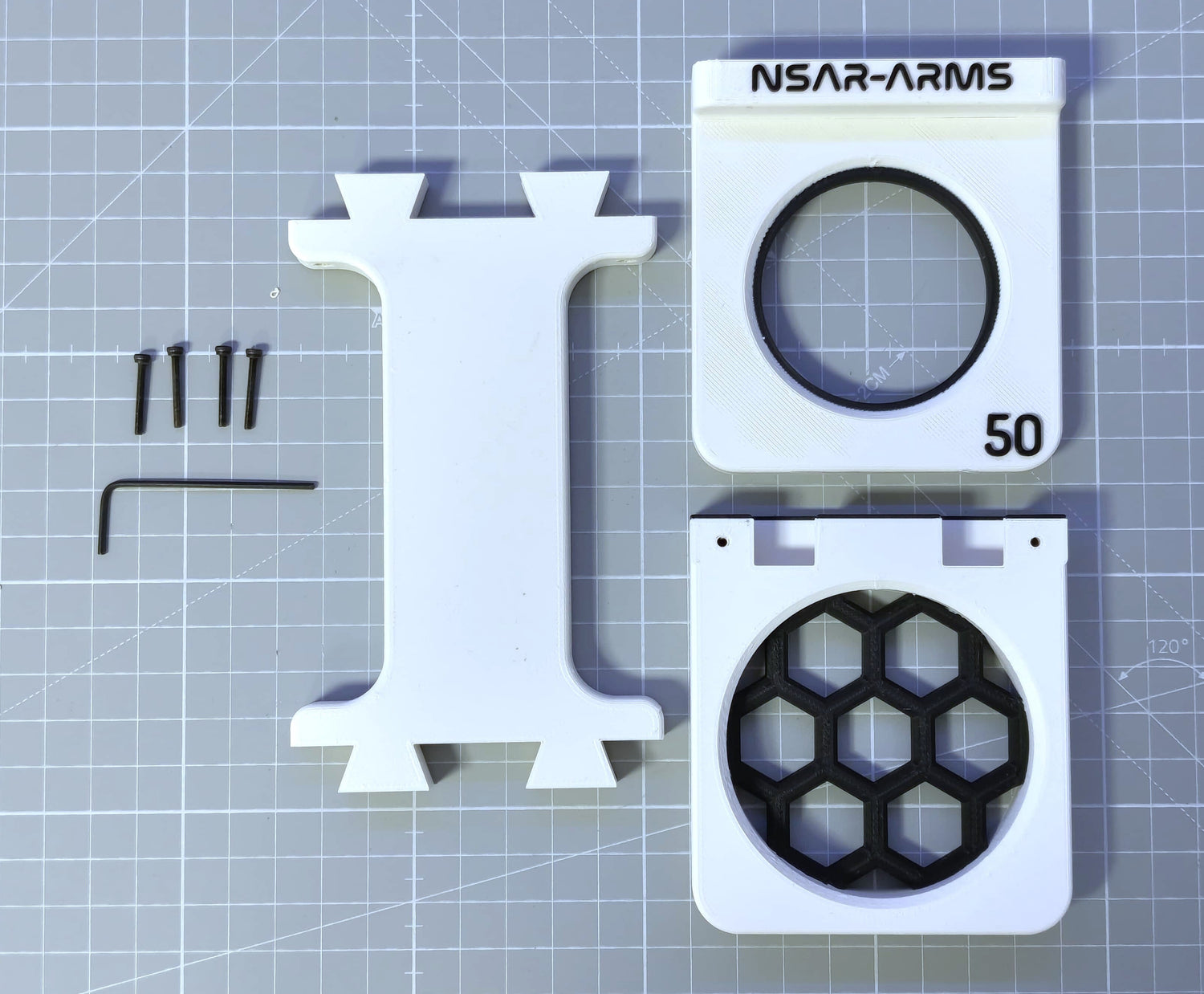 Our silencer mount consists of three main parts and comes with four screws. Assembly is quick and straightforward — simply fit the pieces together and secure them with the screws. No special tools required! Once assembled, the mount itself is rock solid and stays firmly in place — no compromises.